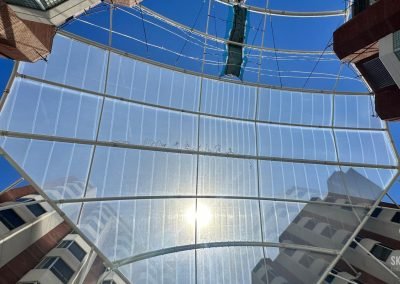 The new entertainment precinct’s atrium structure blends seamlessly with the existing buildings, and the ETFE membrane provides transparency, light, and protection from the elements. The ETFE layer undulates slightly, reminiscent of a gentle wave, and has a 16 mm silver-dot fit pattern specifically selected to meet the thermal and optical requirements. ETFE, or Ethylene Tetrafluoroethylene, is a much lighter alternative to glass structures, offering a modern and elegant solution.